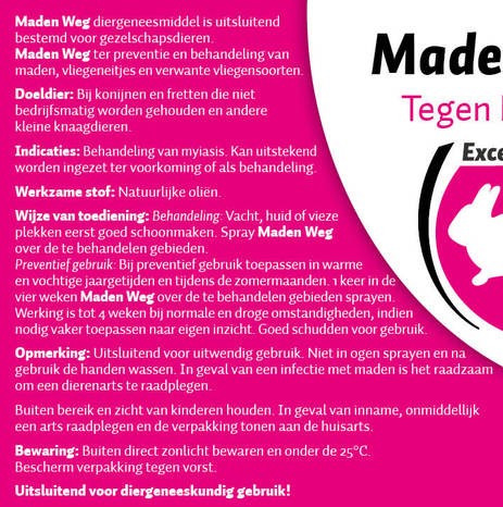 Wij hebben de Excellent Maden Weg spray zelf uitgeprobeerd bij 2 zieke konijnen en zijn erg positief over dit product! Wij hebben daadwerkelijk 0 vliegen bij de konijnen gezien.