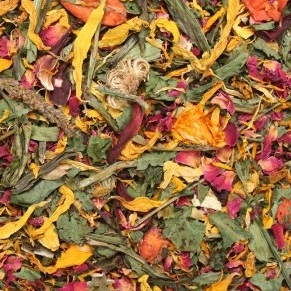 Ingrediënten: Wortel schijven, erwten vlokken, smalle weegbree, 10% goudsbloemen, 10% zonnebloem blaadjes, 10% paardenbloem, hibiscus bloemen en 10% rozen bloemen.